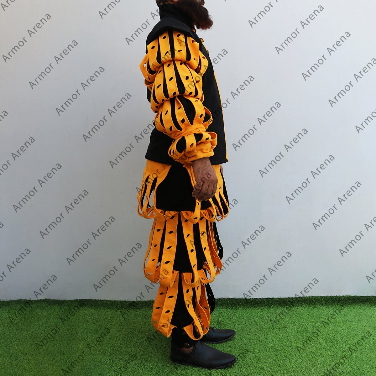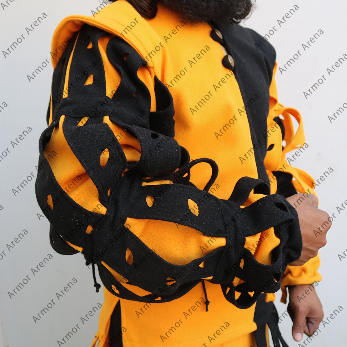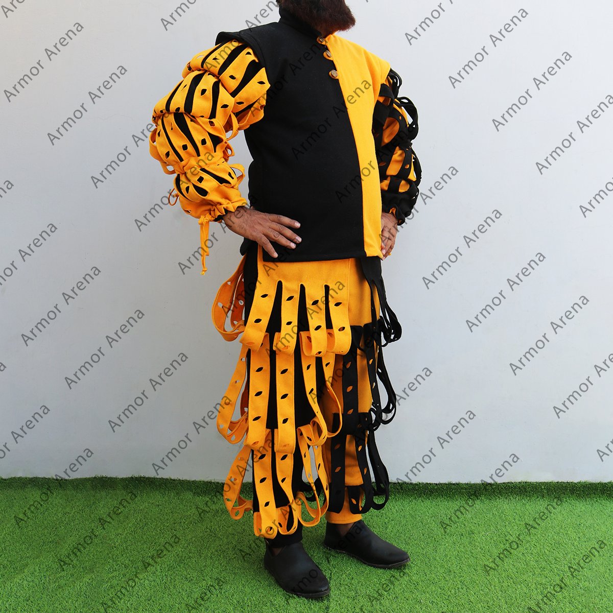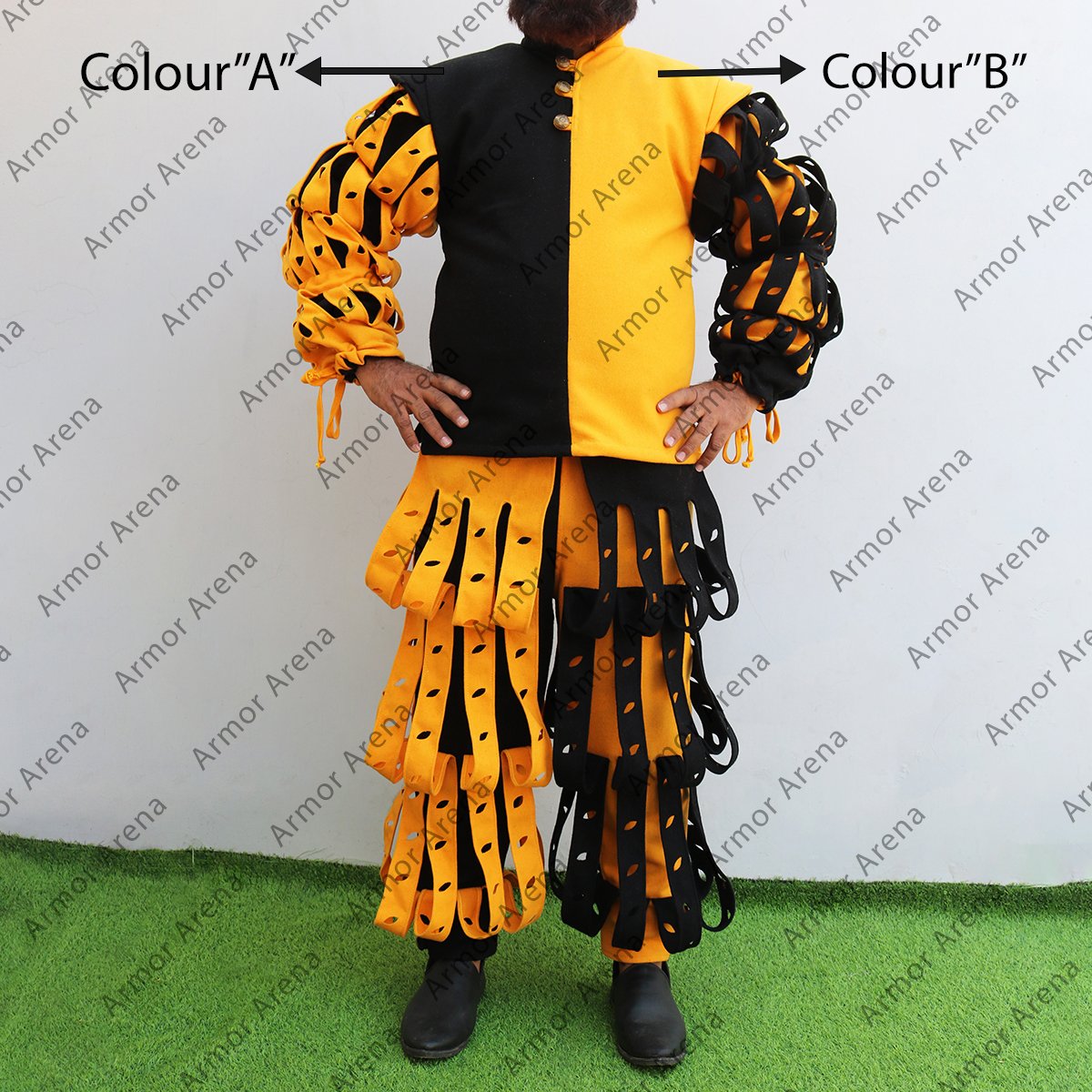 This suit is the Version 2 of the Joerg Landsknecht suit. The Joerg Landsknecht suit is a type of clothing worn by the Landsknechts which is a group of mercenaries in the late 15th and early 16th centuries. The 2 tone Joerg Landsknecht suit is known for its bright colors and distinctive cuts. The Landsknechts began cutting their clothing in the late 15th century because it was too tight for fighting. We have full suit with Landsknecht pants and Landsknecht doublet. Landsknecht pants is known as “hosen” and these pants are iconic to the Landsknechts. Landsknecht doublet is a short jacket made from wool with decorative inserts. The Joerg Landsknecht Suit is made with 100% cotton canvas material using 2 different colors. The cotton canvas fabric provide the durability and authenticity. This Joerg landsknecht doublet have front closing and is designed to wear easily and provide comfort. Medieval Joerg Landsknecht is available in all range of sizes form XS to 2XL/3XL and if buyer required any other size we also provide according to the customer requirements. You can choose the available colors including Black, Brown, Natural, Blue, Olive, Wine Red, Light Grey, and Yellow according to your requirements that best suits your style or historical preference. All Landsknecht clothing are handmade and all suits are unique and may have slight variations from the images shown, adding to its distinctive charm and character. You can buy Joerg Landsknecht suits and other Landsknecht clothing from our website easily with guaranteed lowest prices.