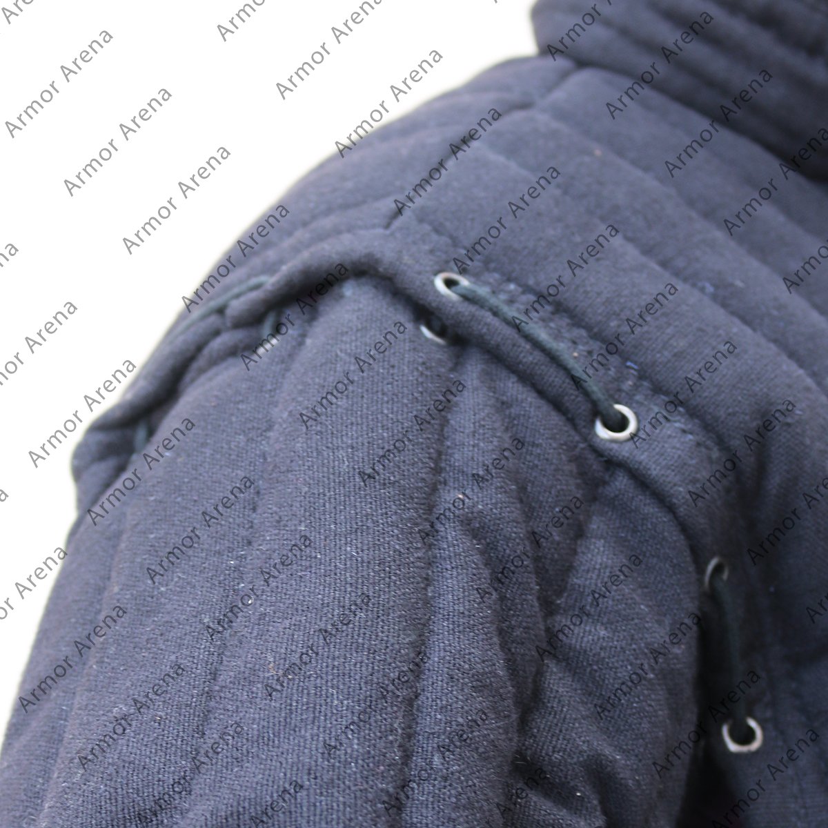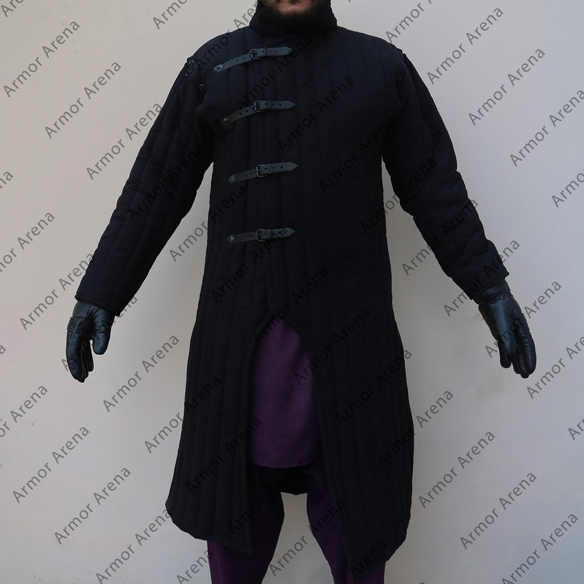This Knights Gambeson Armour offers a great fit for everyone and it is available in all sizes from XS to 3XL. This gambeson long coat made with cotton canvas fabric with polyester padding for protection and cotton lining inside. The lining color changing depending on availability and making each gambeson unique in its style. The leather straps and steel buckles are used in the front closing. All quilted gambeson are crafted carefully that maintain the authenticity of historical time and there may be slight differences in every gambeson which adding to its special charm.