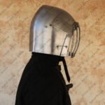 Bascinet with grilled visor designed with mild steel to provide authenticity, comfort and quality in mind and inner foam padding provide a comfort while wearing it for a long time or any long event and a durable leather chin strap with a secure buckle closure. Each bascinet helm is custom made according to customer requirements and size to ensure that a perfect fit.