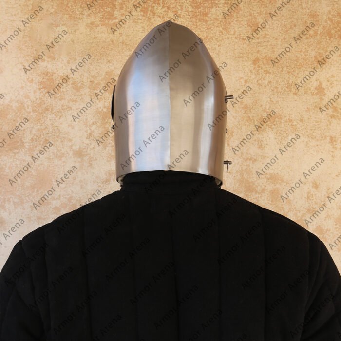 Our Peaked Bascinet with visor grill is inspired by the original that is deposited in the Musée de Valere, Sion, dated 1380-1400. Similar models of bascinet were found in archaeological excavations dated 14th century. But only few miniature paintings confirm the usage of such helmets by medieval warriors. The face opening is protected by a visor grill that is connected to the helmet bowl by means of four pegs. The face guard is removable. The peak moderates the striking force of cuts directed against the head.
