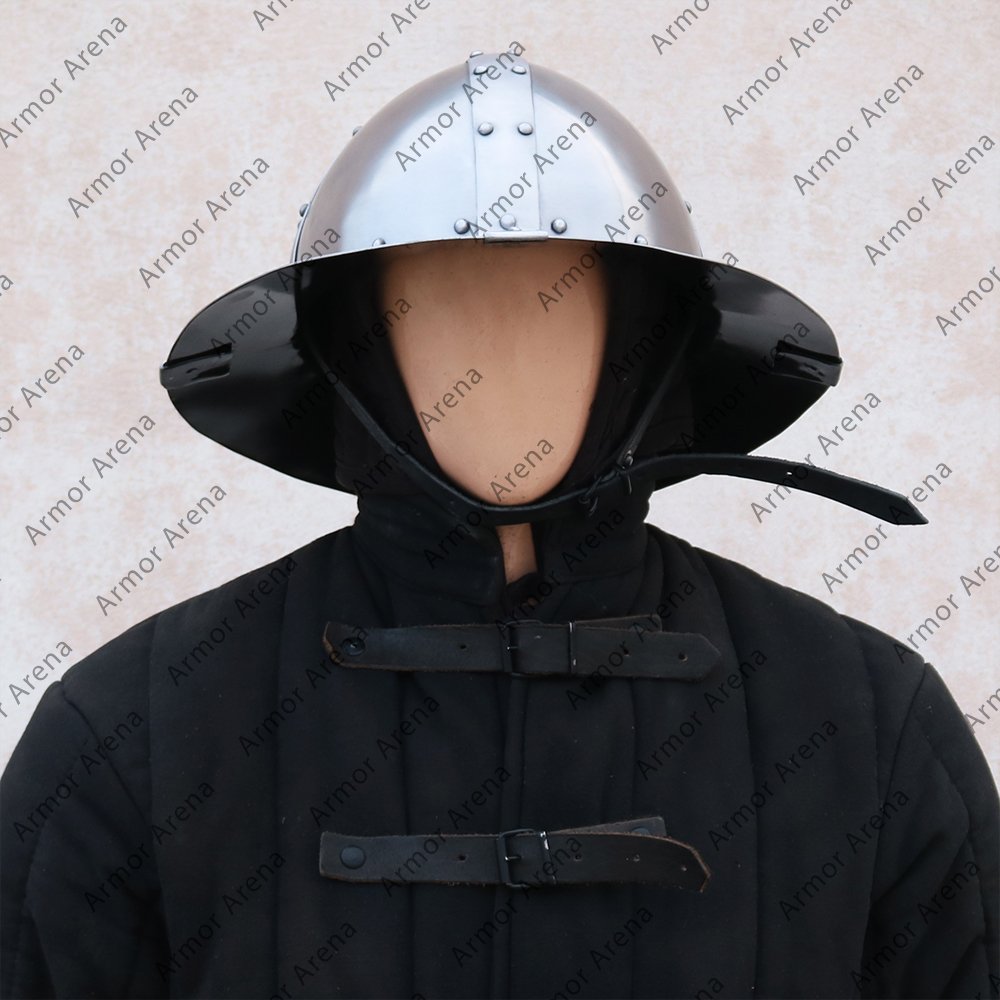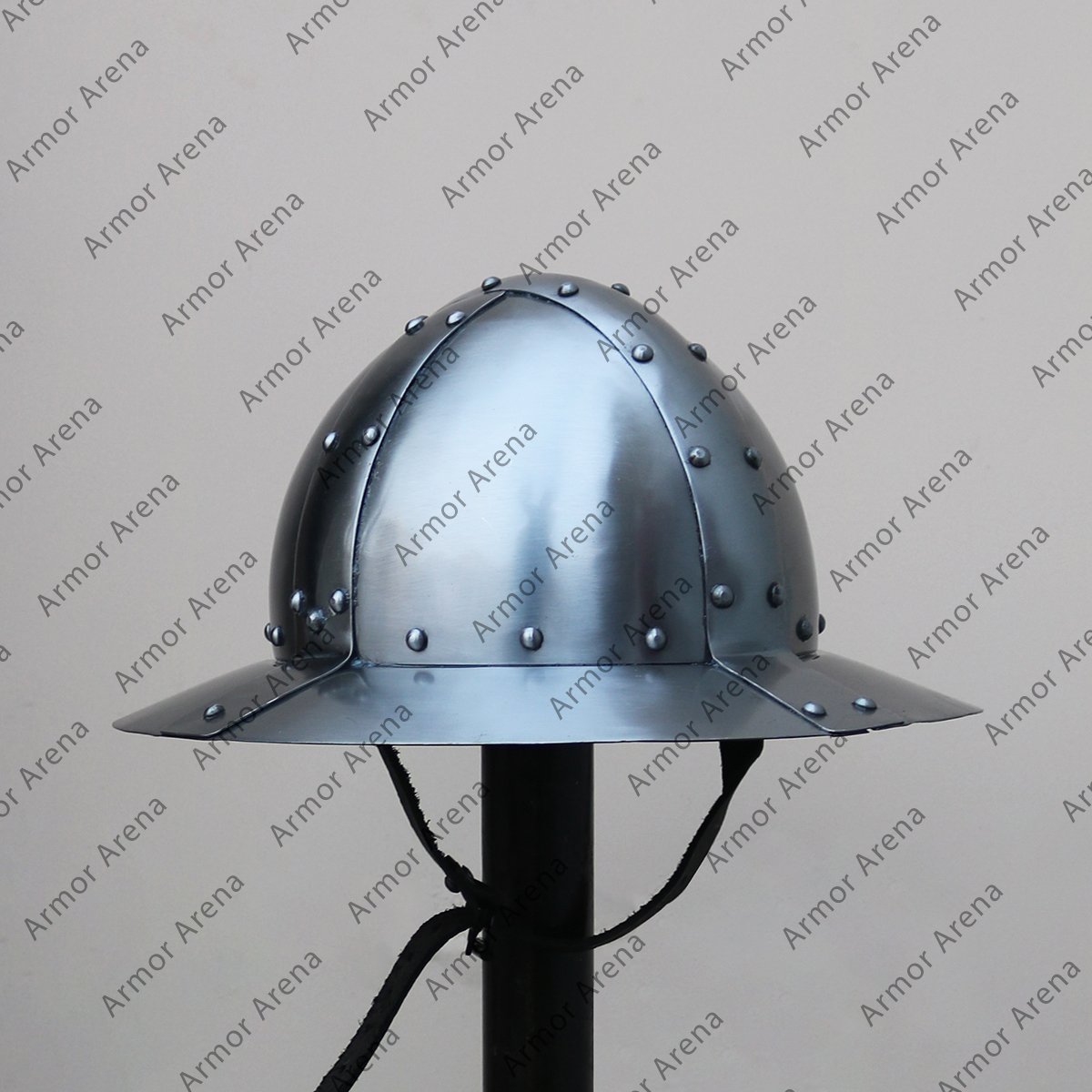 Medieval War Hats were very popular with foot soldiers in Central Europe during the 10th and 15th century. A Viking hat made of steel was common all over Medieval Europe. There are many designs and variations in Kettle hats. The name comes from its resemblance to a metal cooking pot. Medieval Knight Hats were worn by troops of all types of warriors. Medieval soldier hat design with mild steel to provide authenticity, comfort and quality in mind and inner foam padding provide a comfort while wearing it for a long time or any long event and a durable leather chin strap with a secure buckle closure. Each war hat is custom made according to customer requirements and size to ensure that a perfect fit.