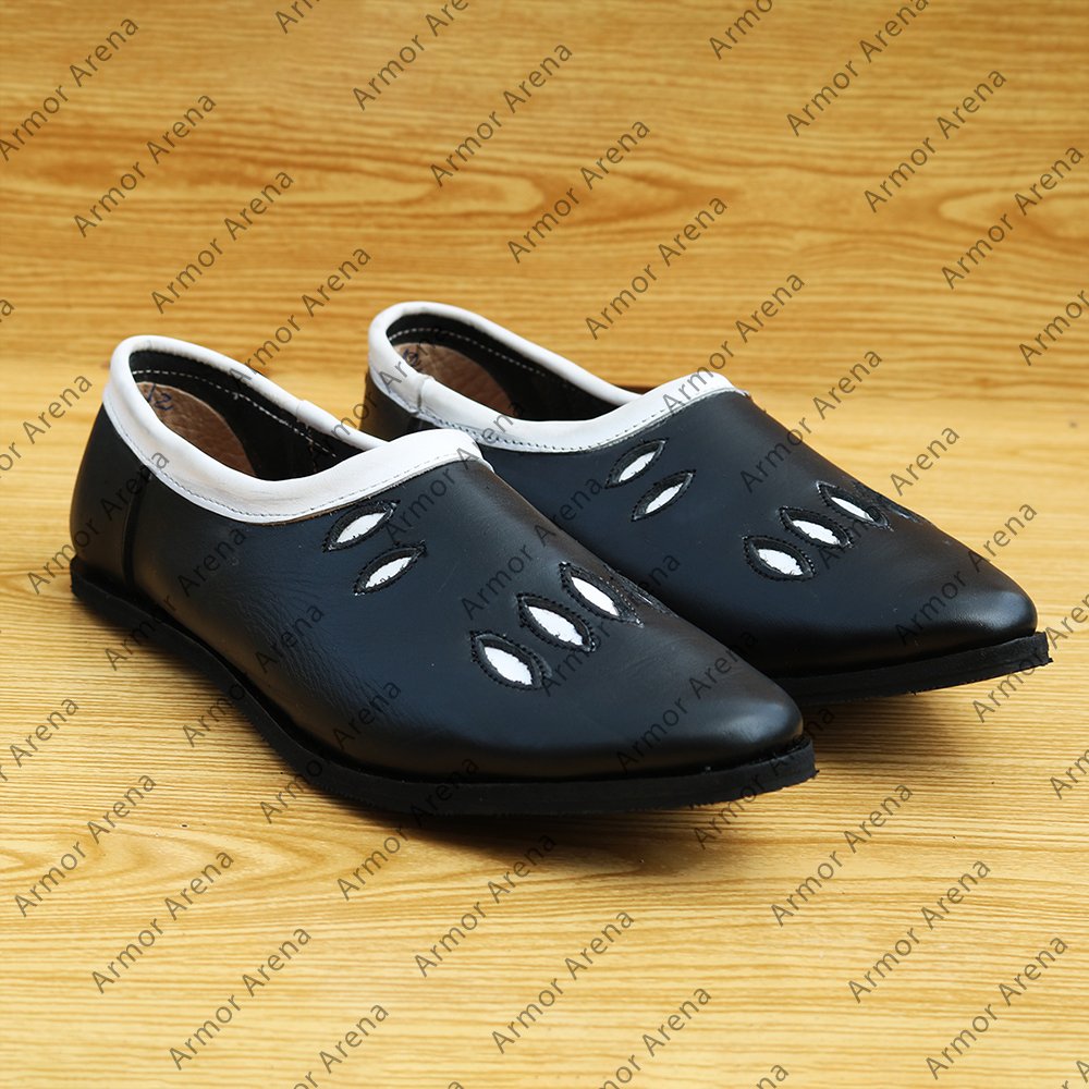 Tudor shoes were often decorated with leaf cuts which included flower petals and leaves. The cuts enhance the beauty of shoes and made for decoration in the Tudor era. Tudor shoes were used or worn during the 14th to 16th century which was Tudor era. Tudor Leather Footwear were specified by broad toes and flat soles and use buckle or strap and were made with leather. The small leaf cuts Tudors are made carefully with focus on detail and craftsmanship to ensure they are both durable and historically accurate. Tudor womens shoes are a great choice for reenactments, LARP events or medieval battles. These Tudor leather footwear are crafted from high quality cowhide leather which provide an authentic look and comfort while wearing in the events or in battlefields. We have 3 Types of sole so you can choose from three sole types to fit your needs: the classic leather sole for a traditional style other is leather sole with a rubber sheet for better grip on modern surfaces and the last one is leather sole with steel nails for extra strength and a rugged look. These options let you customize the shoes for different activities and terrains.